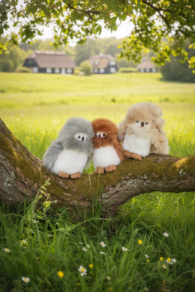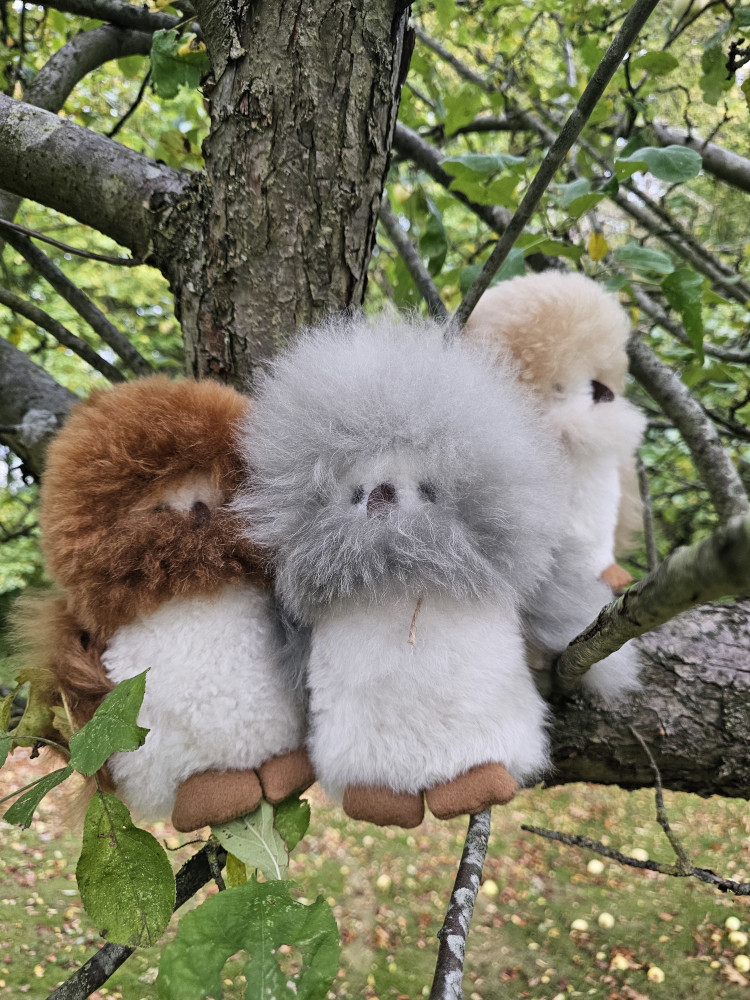 Denne charmerende uglebamse er håndlavet af naturlig, superblød alpacauld.